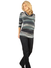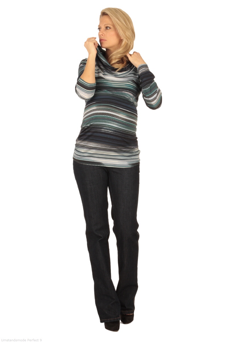 Dieser Pullover im frischen Ringelmuster hat einen grossen weiten Kragen, der sich vielseitig drappieren lässt. Der leichte Stoff ist sehr angenehm auf der Haut, der hohe Elasthan-Anteil sorgt für hohen Tragekomfort auch bei wachsendem Bauch.
