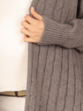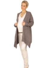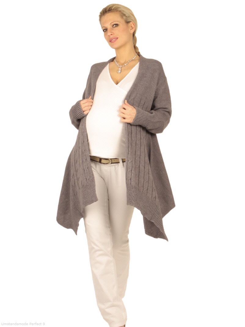 Der schlichte Cardigan Sofia mit seinen Strickzöpfen hat Kultcharakter. Durch die schöne graue Farbe lässt sich der Cardigan herrlich vielseitig kombinieren. Der Mantel kann offen getragen werden oder mit einer mitgelieferten modischen Nadel über dem Bauch geschlossen werden. Der hohe Kragen und die langen Bündchen an den Ärmeln geben diesem Kleidungsstück die besondere Note. Sofia lässt sich übrigens auch nach Ihrer Schwangerschaft tragen.
